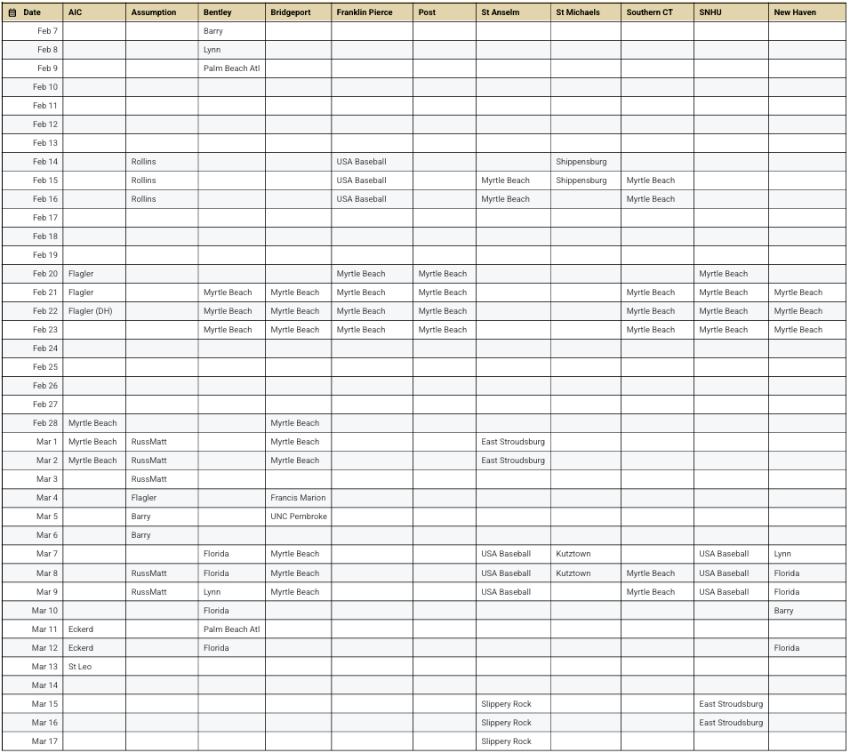 D2 baseball in New England can be very challenging, but coaches have done a great job putting together schedules prior to the NE-10 or CACC conference schedules. This weekend marks the first weekend teams really get going; after this weekend, all D2 teams would have played their first game.